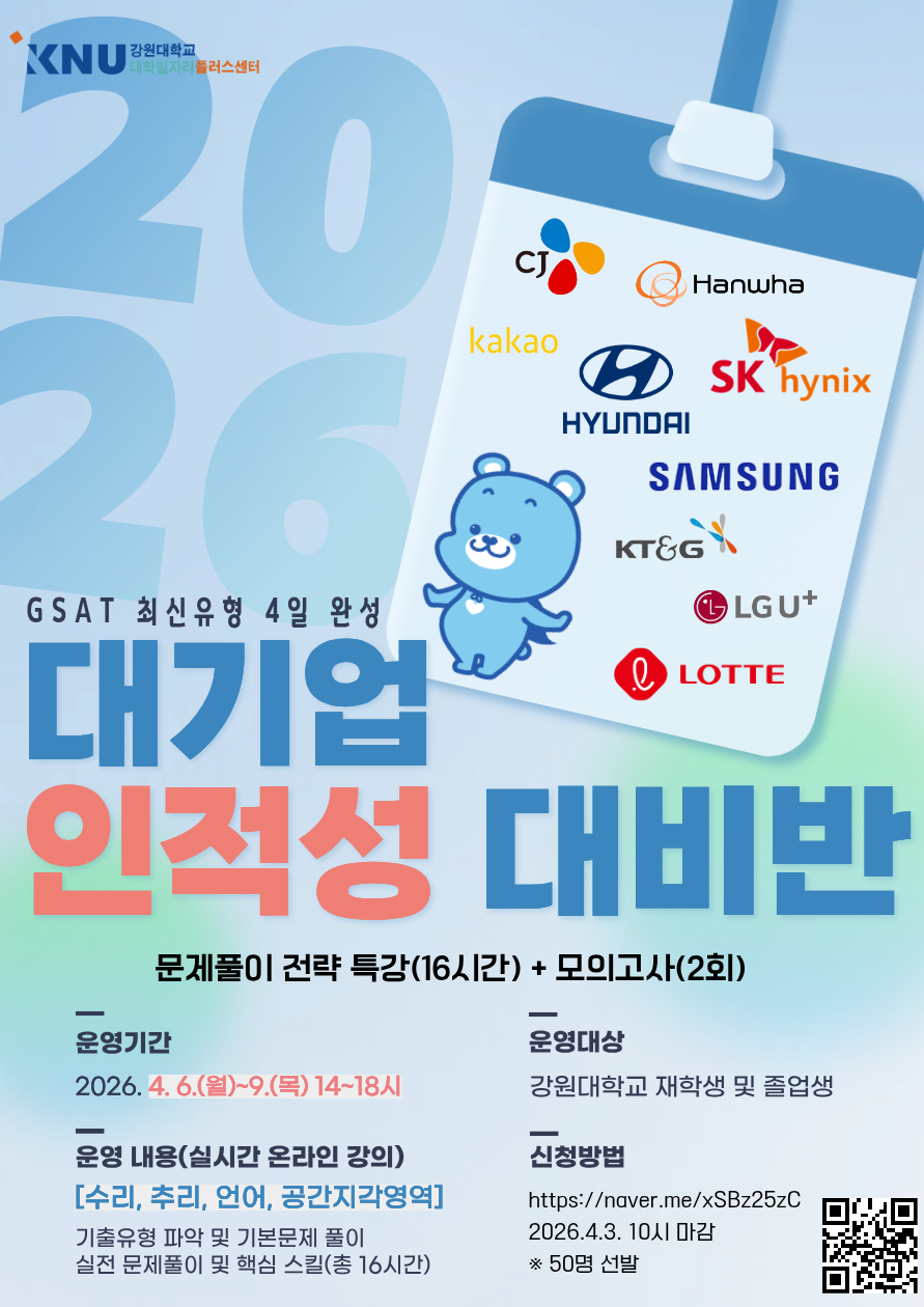 2. 대기업 채용 전형인 ‘인적성검사’ 유형에 대비하기 위한「2026 대기업 인적성 대비반」을 다음과 같이 운영하오니 관심있는 학생들이 참여할 수 있도록 홍보하여 주시기 바랍니다.